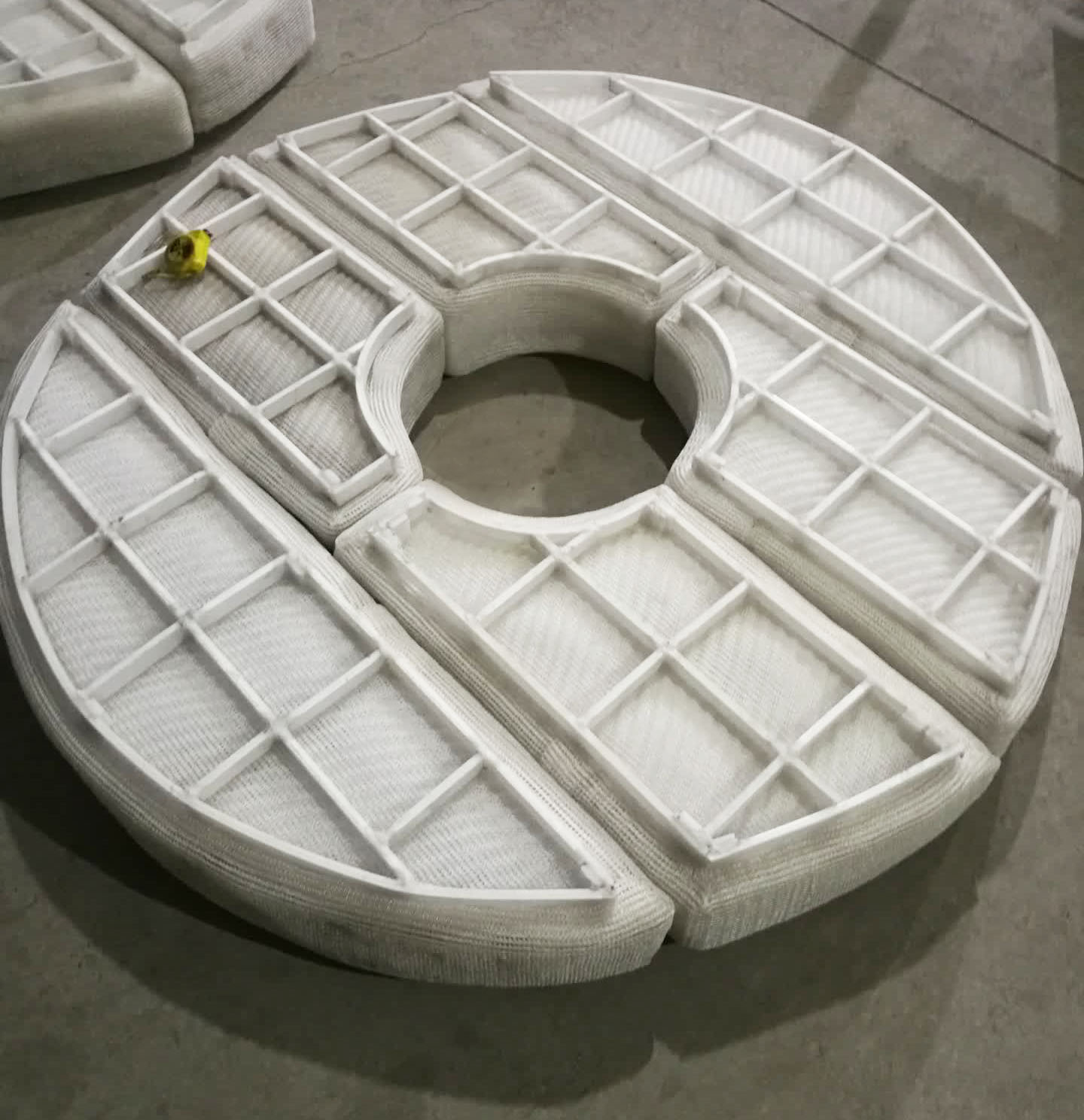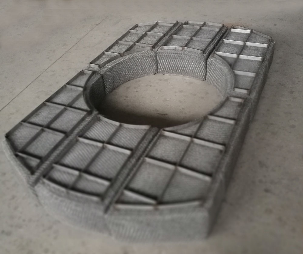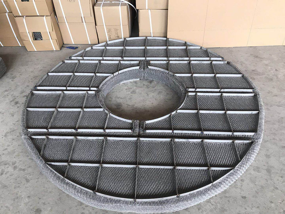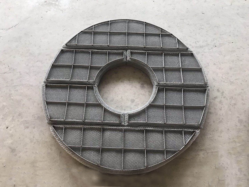 絲網(wǎng)除沫器主要是由絲網(wǎng)、絲網(wǎng)格柵組成絲網(wǎng)塊和固定絲網(wǎng)塊的支承裝置構(gòu)成,絲網(wǎng)為各種材質(zhì)的氣液過(guò)濾網(wǎng),氣液過(guò)濾網(wǎng)是由金屬絲或非金屬絲組成。氣液過(guò)濾網(wǎng)的非金屬絲由多股非金屬纖維捻制而成,亦可為單股非金屬絲。該絲網(wǎng)除沫器不但能濾除懸浮于氣流中的較大液沫,而且能濾除較小和微小液沫,廣泛應(yīng)用于化工、石油、塔器制造、壓力容器等行業(yè)中的氣液分離裝置中。